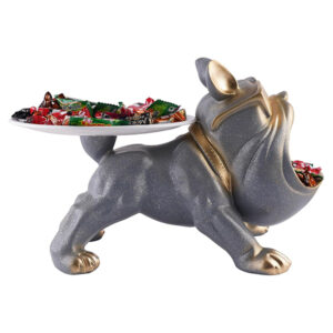 Enhance your home décor with this unique 10-inch bulldog candy holder. Featuring a stylish bulldog wearing gold sunglasses and a collar, this modern resin tray is perfect for holding candies, snacks, keys, or small accessories. Designed with a dual-storage function, it offers a spacious bowl in the mouth and a flat tray on the tail for extra convenience. Its elegant gray and gold finish makes it a luxurious and eye-catching addition to any space, including homes, offices, and cafés.