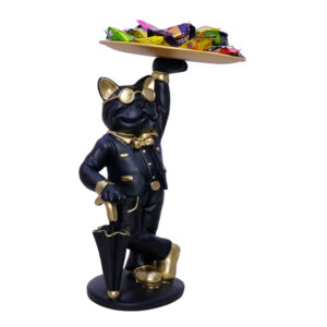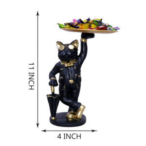 Add a touch of luxury to your home with this stylish 11-inch black cat butler figurine. Dressed in an elegant suit with gold accents, this decorative piece features a raised serving tray, perfect for holding candies, jewelry, keys, or small accessories. A charming fusion of art and functionality, it’s a unique addition to your living space, office, or gift collection.