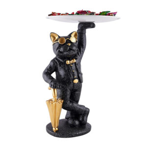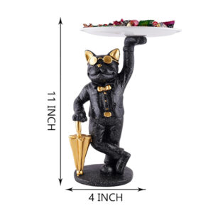 Enhance your home décor with this 11-inch black resin cat butler candy holder. Designed with gold accents, sunglasses, and an umbrella, this stylish piece serves as a functional tray for candies, keys, or small accessories. A unique and elegant addition to coffee tables, offices, or entryways.