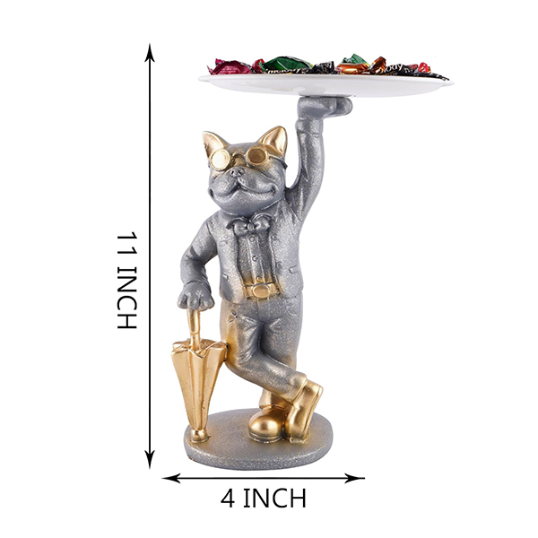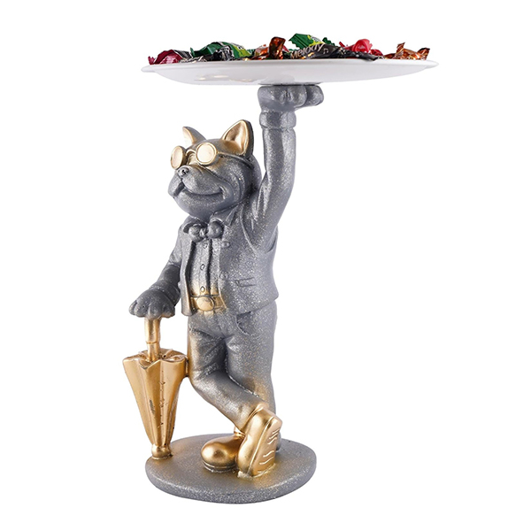 Add a touch of elegance and whimsy to your home with this 11-inch silver cat butler tray. Crafted from premium resin, this stylish feline wears a dapper suit with gold accents, holding an umbrella while balancing a tray for serving candies, jewelry, keys, or small accessories. A perfect blend of function and artistic charm, making it an ideal décor piece or gift for cat lovers.