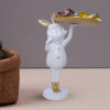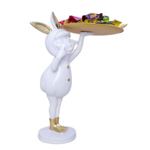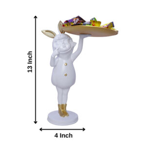 Elevate your home décor with this charming 13-inch tall decorative bunny tray stand. Crafted with a stylish white and gold finish, this artistic figurine doubles as a practical snack or candy holder. Ideal for living rooms, offices, or entryways, it adds a playful yet elegant touch to any space.