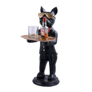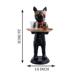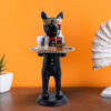 Elevate your home or bar décor with this striking 26-inch French Bulldog butler statue. This stylish resin figurine features a black bulldog wearing gold sunglasses and a tuxedo, holding a golden tray perfect for serving drinks, snacks, or organizing small items. A statement piece that combines function with modern aesthetics, ideal for homes, lounges, cafés, and luxury spaces.