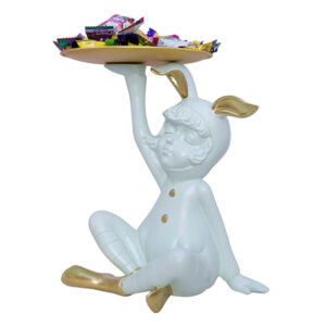 Enhance your home décor with this adorable 9.5-inch white bunny boy figurine. Featuring gold accents and a charming pose, this decorative sculpture comes with a serving tray, ideal for holding candies, keys, jewelry, or small accessories. A unique blend of functionality and artistic elegance, it adds a playful yet stylish touch to any space.