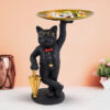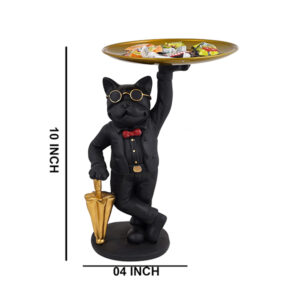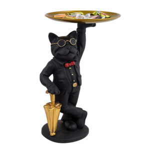 Elevate your décor with this Stylish French Bulldog Butler Candy Tray. Dressed to impress in a black suit, gold-rimmed glasses, and red bowtie, this 10-inch tall figurine holds a golden serving tray while casually leaning on a gold umbrella. It’s both a charming decorative piece and a practical tray for candies, jewelry, or keys.