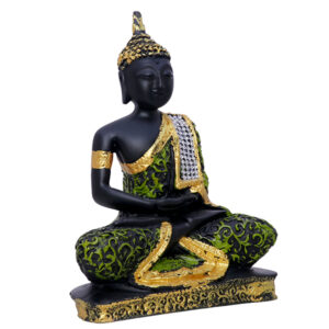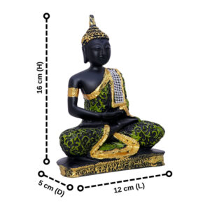 Bring peace, positivity, and elegance to your space with this intricately crafted Sitting Buddha Idol. Measuring 16 cm in height, it features a black and gold finish with ornate green detailing and shimmering accents, making it a standout piece for home décor, meditation corners, or office desks. Its compact design (12 cm L x 5 cm D x 16 cm H) fits beautifully on shelves, tables, or as part of your altar setup. A thoughtful gift for housewarmings, festivals, or spiritual occasions.
