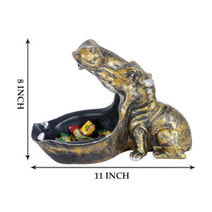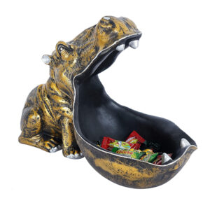 This 11-inch golden hippo candy dish is a playful yet elegant addition to your home or office. Designed with striking black and gold contrast, its wide-open mouth serves as a functional bowl for candies, snacks, or trinkets. Made from durable resin, this hippo figurine brings charm and character to any tabletop or entryway.