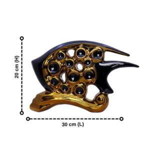Add a splash of marine elegance to your décor with this Golden & Black Ceramic Fish Figurine. Designed with a modern artistic flair, the fish features a cut-out bubble design, a glossy golden base, and a sleek black upper body for a striking contrast. Measuring 30 cm in length and 20 cm in height, it’s an eye-catching statement piece that’s perfect for shelves, console tables, or offices.