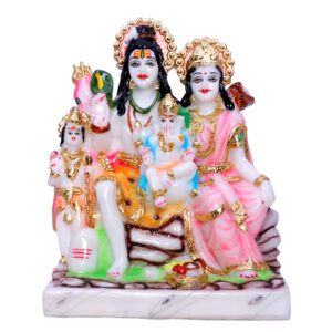 The Shiv Parivar idol showpiece from GW Creations is a breathtaking representation of divine unity, grace, and spiritual strength, meticulously crafted from high-quality marble. Standing at an impressive 9 inches, this exquisite piece is adorned with golden foil work, adding a touch of opulence and elegance to its appearance. Ideal for enhancing the spiritual ambiance of any home or office, the idol beautifully captures the essence of Lord Shiva, Goddess Parvati, and their children, Ganesha and Kartikeya, symbolizing harmony and familial devotion. The intricate detailing and glossy finish highlight the exceptional craftsmanship of skilled artisans, making it a cherished centerpiece that embodies both beauty and spiritual significance.