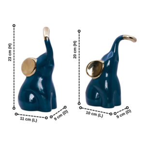 Each elephant is sitting with its trunk raised—a symbol of luck and positivity—making this duo a meaningful addition to any room. The tall elephant measures 23 cm (H) x 11 cm (L), while the smaller one is 20 cm (H) x 10 cm (L). Both have a depth of 9 cm, making them ideal for compact spaces.