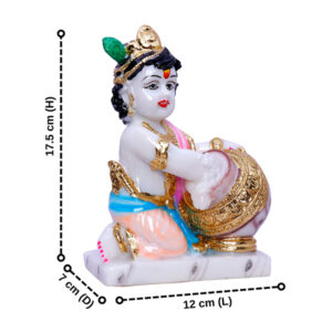 The Makhan Chor idol showpiece from GW Creations is a delightful embodiment of youthful playfulness and divine charm, meticulously crafted from high-quality marble and adorned with luxurious golden foil work. Standing gracefully at 7 inches, this exquisite piece captures the joyful essence of Lord Krishna as the beloved butter thief, symbolizing joy and mischievous innocence. The glossy finish enhances its elegant appearance, making it a perfect addition to both home and office spaces. The idol’s intricate detailing reflects the exceptional craftsmanship of skilled artisans, ensuring it becomes a cherished centerpiece that radiates spiritual grace and playful energy.